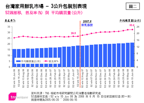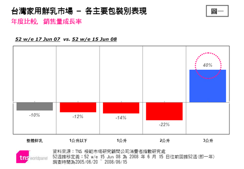 | 自去年夏天乳製品類價格全面飆漲後,優酪乳、乳酸飲料等主要品類買氣節節敗退,鮮乳市場也逃不過漲價的衝擊,今年度銷售衰退幅度甚至達到一成。調查發現,價格調漲後,大包裝規格開始受青睞,買氣突破四成。 | ||